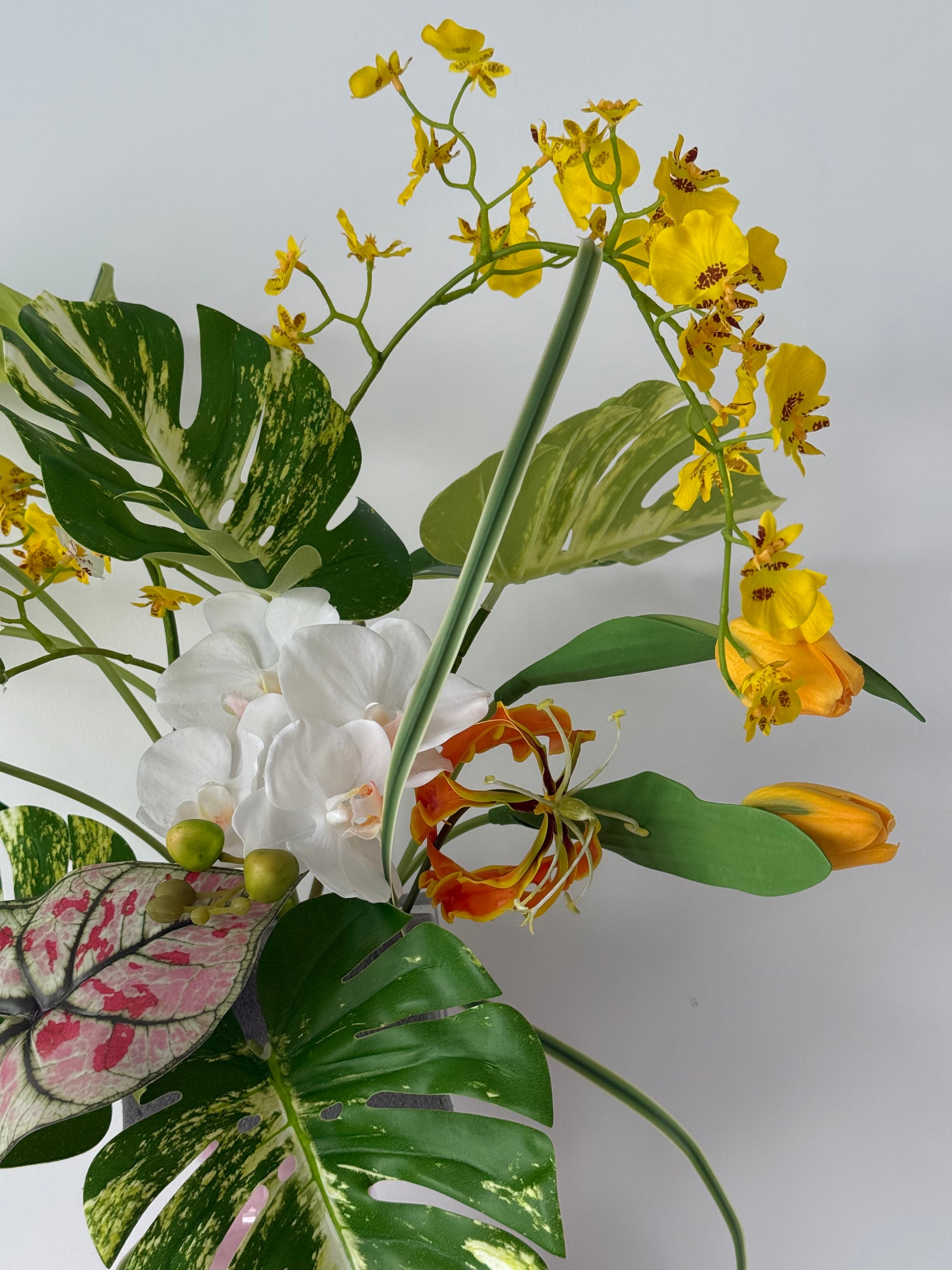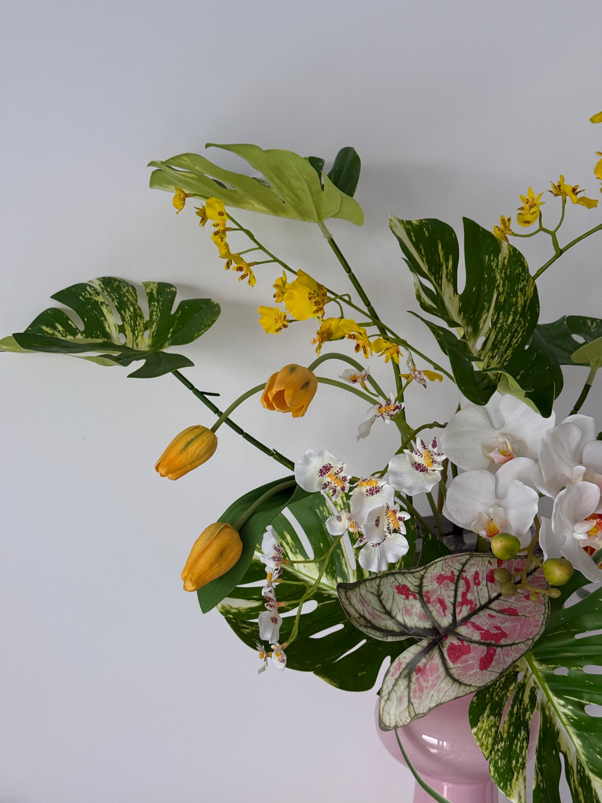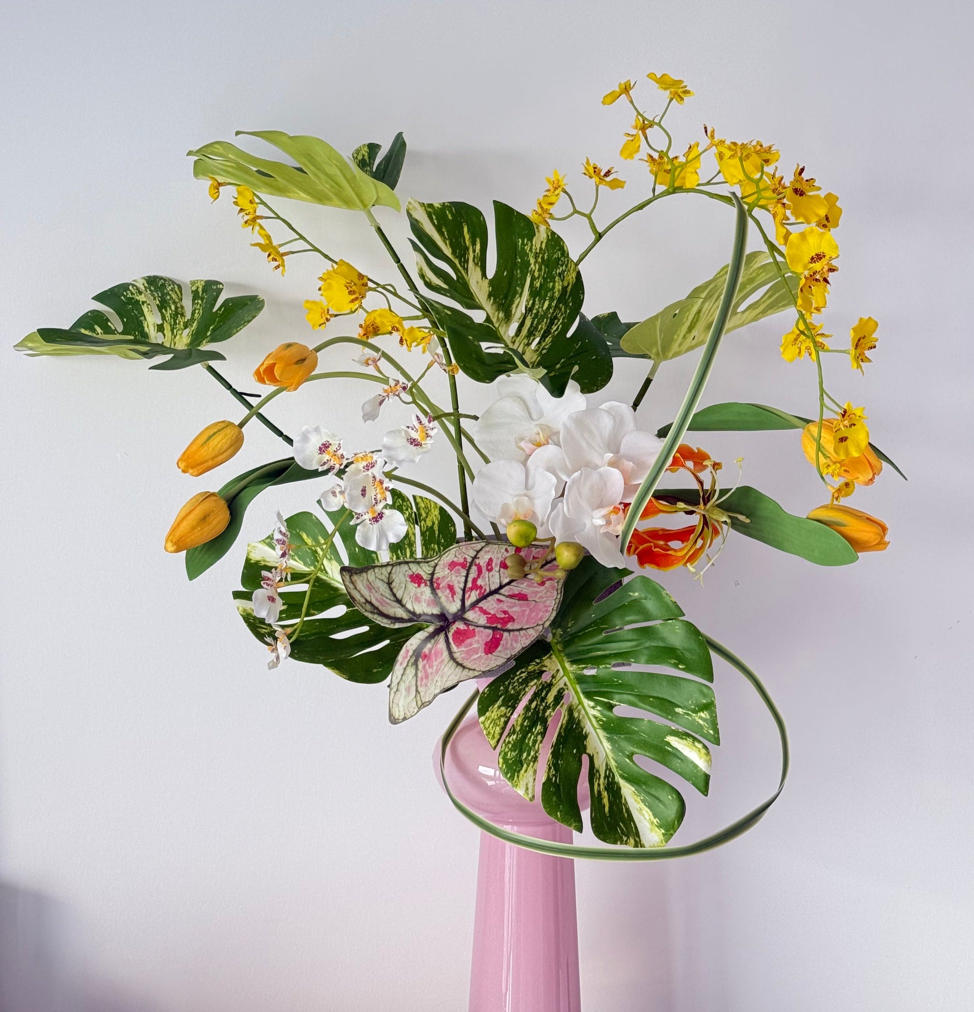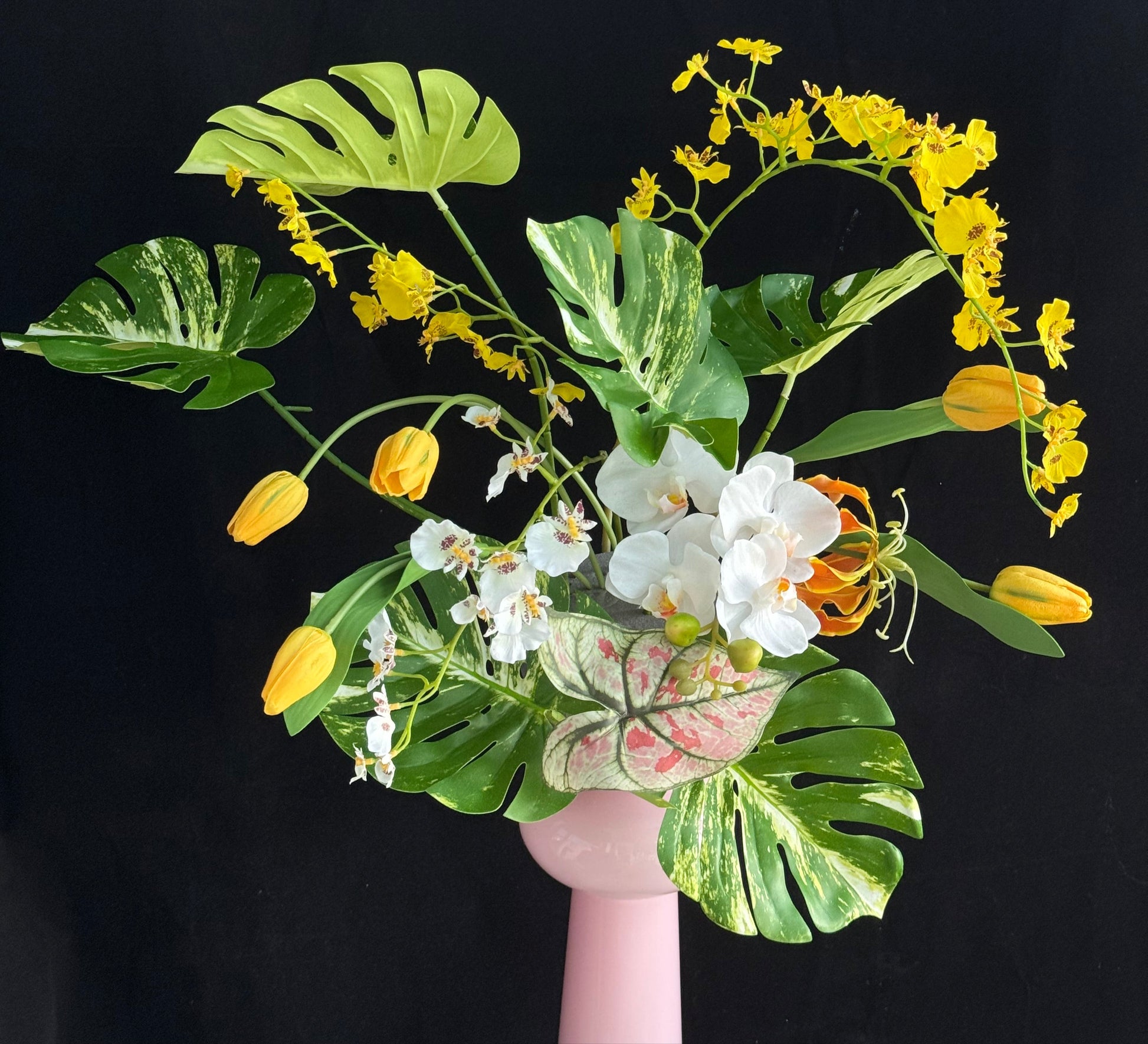 Golden tulips, dancing oncidiums, and fiery gloriosa meet lush variegated greens — all set in a blush-toned vase that softens the wild with elegance.